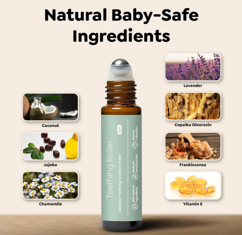 The Teething Soothing Roller is formulated with naturally derived botanicals chosen for their clinically recognized calming and anti-inflammatory properties. By delivering these compounds directly to the gums through a precise roll-on application, it helps reduce localized discomfort, ease irritability, and support overall soothing during the teething phase. The result: gentle, effective relief that is safe for daily use — without synthetic chemicals, harsh additives, or unnecessary fillers.